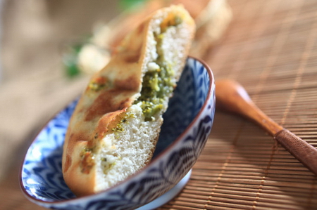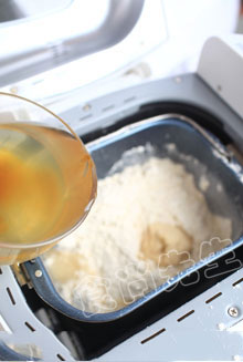 Công thức nguyên liệu: Bột mì đặc biệt của Pháp: 500g, men khô: 4g, muối: 10g, chiết xuất mạch nha: 2g, bột già: 100g, nước: 300g