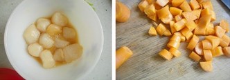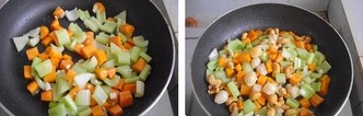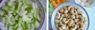 4. Đun nóng dầu trong nồi, phi tỏi băm, gừng băm, cho sò điệp tươi vào xào chín, cho cà rốt, cần tây, chút muối vào xào một lúc, cho hạt điều vào xào chín, nêm chút xì dầu nhạt, một thìa cà phê Cho nước bột bắp vào xào nhanh tay, cho ra đĩa.