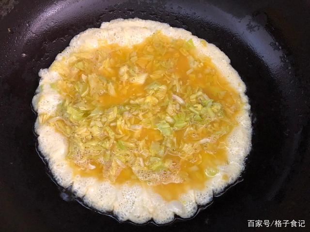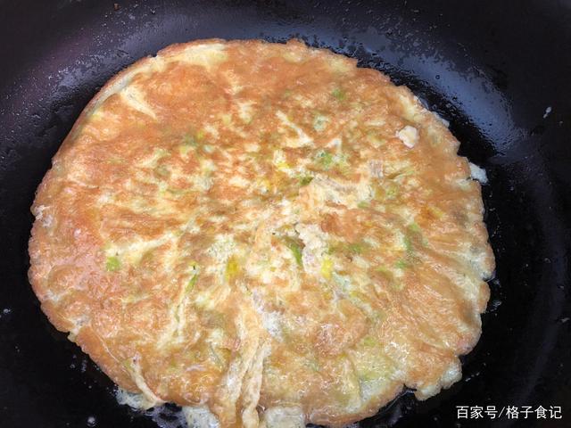 Bước 5: Đun nóng nồi, cho lượng dầu ăn thích hợp, đổ trứng đã khuấy đều vào nồi, vặn nồi, để dung dịch trứng dàn đều dưới đáy nồi và tạo thành bánh hình tròn. Chiên ở lửa vừa và nhỏ cho đến khi bề mặt hơi đông lại.