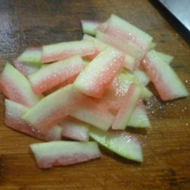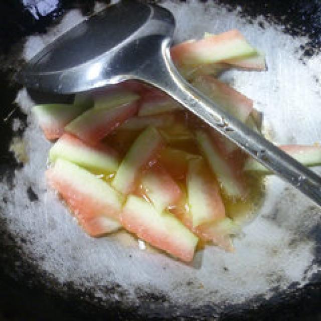 Bước 7: Đổ dầu vào nồi đun nóng, cho phần vỏ dưa hấu đã cắt vào xào chín.